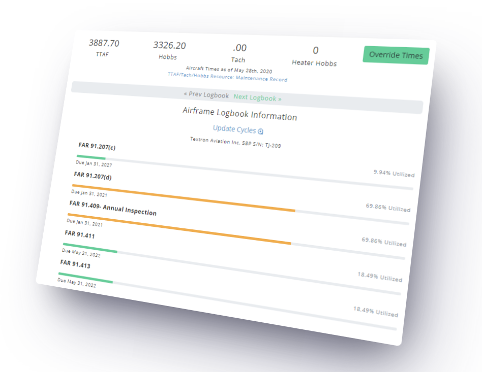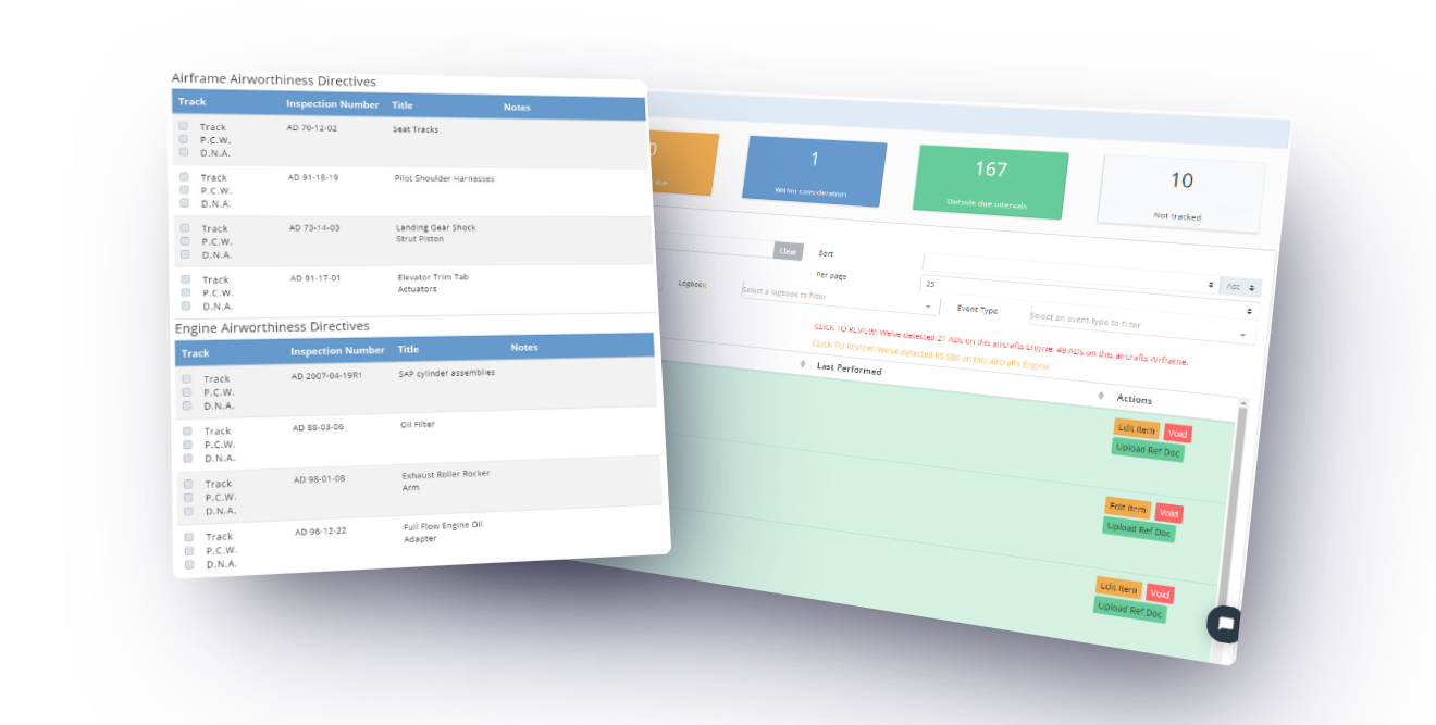 See required VFR/IFR inspection statuses and monitor service intervals like oil changes, etc.